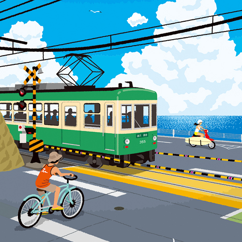 江ノ島へ渡る途中の弁天橋で海を眺める二人と、カモメたちを描きました。